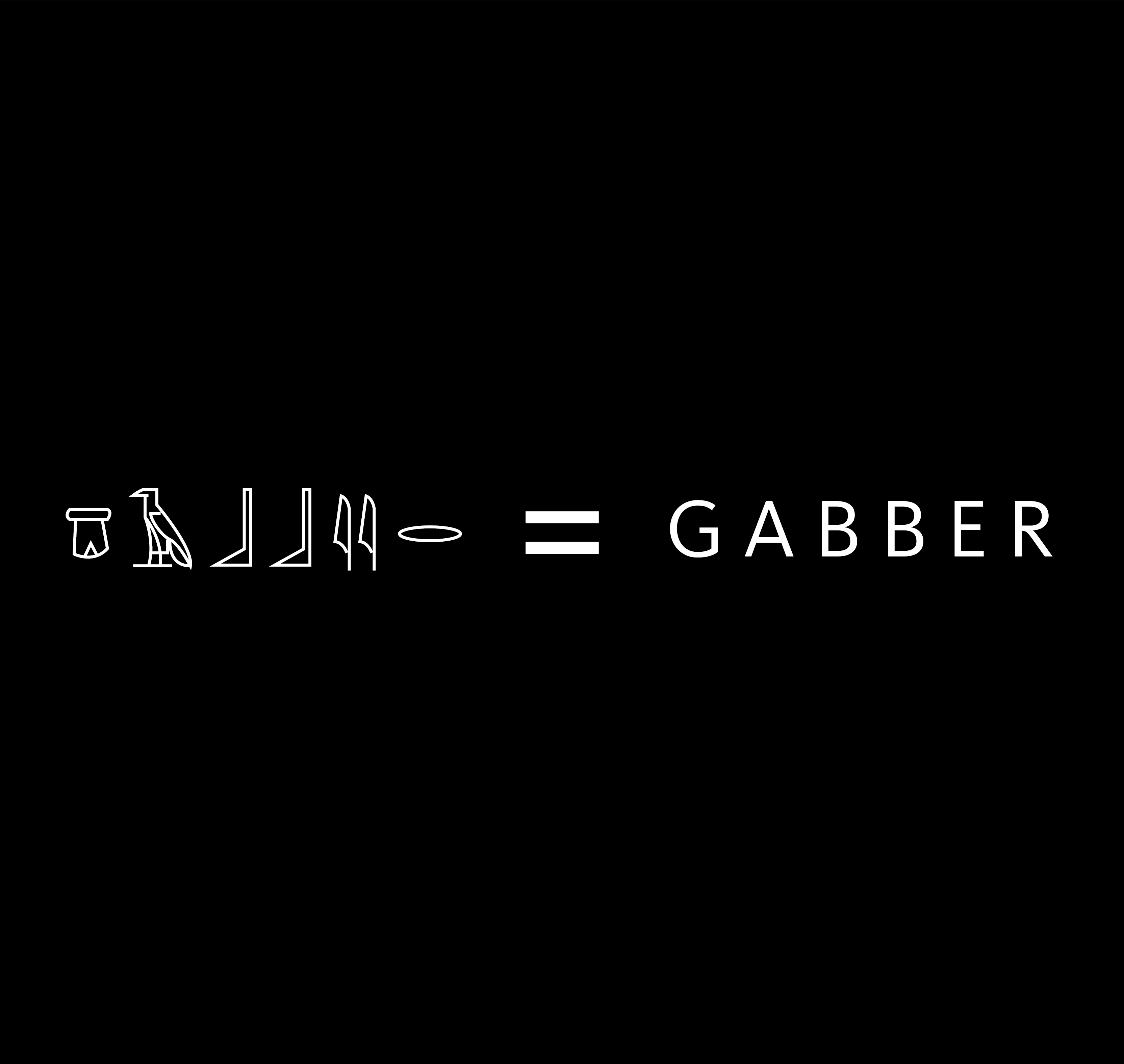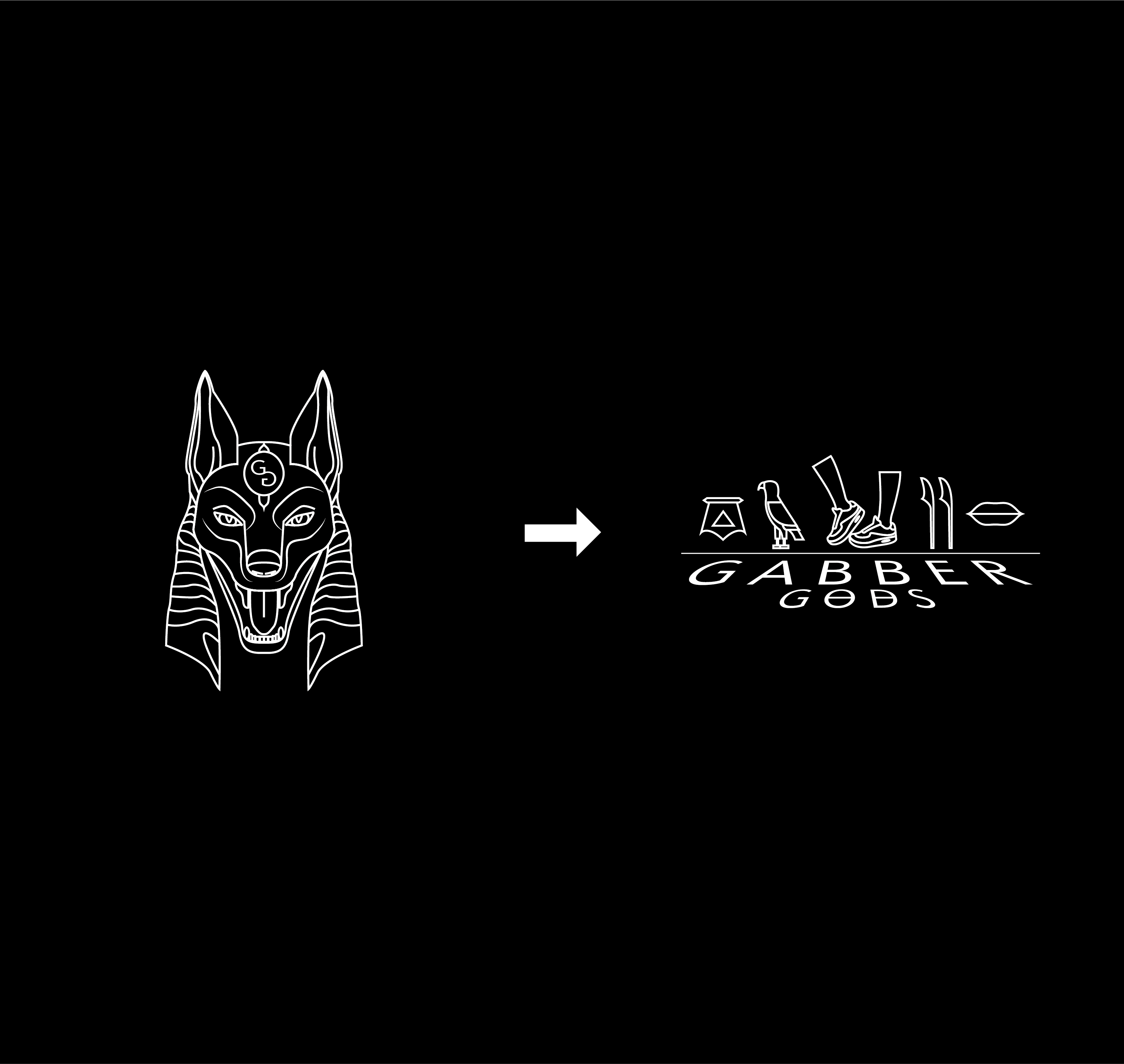 Der GabberGods Schriftzug interpretiert das Wort Gabber durch Hieroglyphen neu.